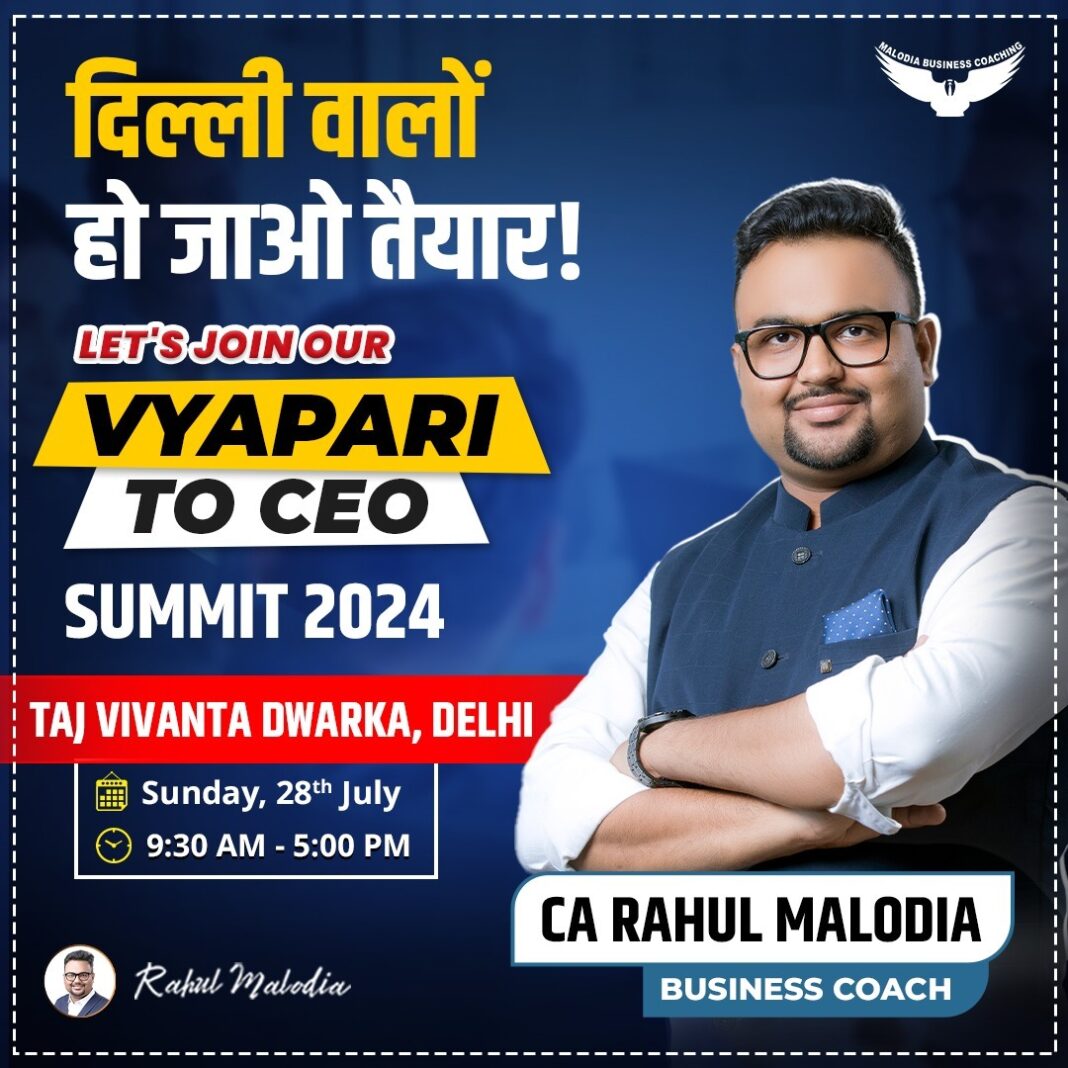 , 26 July, 2024 : बिज़नेस में बदलाव लाने और कॅरियर में नई-नई उपलब्धियां दिलाने वाले भारत के अग्रणी संस्थान मालोदिया बिजनेस कोचिंग द्वारा देश के एक जाने-माने बिजनेस कोच सीए राहुल मालोदिया के नेतृत्व में बहु-प्रतीक्षित ‘व्यापारी टु सीईओ’ कार्यक्रम का आयोजन किया जा रहा है। दिल्ली में रविवार, 28 जुलाई को प्रतिष्ठित होटल ताज विवांता, द्वारका में सुबह 9:30 बजे से शाम 5:00 बजे तक इस कार्यक्रम का आयोजन होगा।