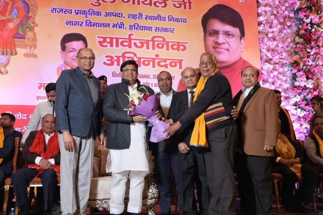 फरीदाबाद – श्री अग्रसेन समाज ने समाज सेवा में अग्रणी रहे श्री आई डी महाजन जी के नेतृत्व मे कैबिनेट मंत्री श्री विपुल गोयल जी का सार्वजनिक अभिनन्दन कार्यक्रम मे स्वागत किया गया । श्री अग्रसेन समाज ने महाराजा अग्रसेन जी की मुर्ति स्थापना के अनुकूल जगह एवं महाराजा अग्रसेन मार्ग की मांग को उनके समक्ष रखा । जिस पर श्री विपुल गोयल जी ने तुरंत प्रभाव से इस पर काम करने का आश्वासन समाज को दिया। इससे पुरे समाज मे खुशी की लहर दौड़ पड़ी एवम माननीय मंत्री जी का धन्यवाद और आभार प्रकट किया तथा जल्दी ही उनके ही द्वारा मूर्ति का अनावरण हो एसी कामना की।श्री अग्रसेन समाज के अध्यक्ष आई डी महाजन कार्यकारी अध्यक्ष, अरूण बजाज सचिव, भगवत दयाल अग्रवाल,योगेश गोयल एवम एम एल मोदी आदि समाज के अनेक गणमान्य लोगो ने मंत्री जी का स्वागत आभार प्रकट किया।