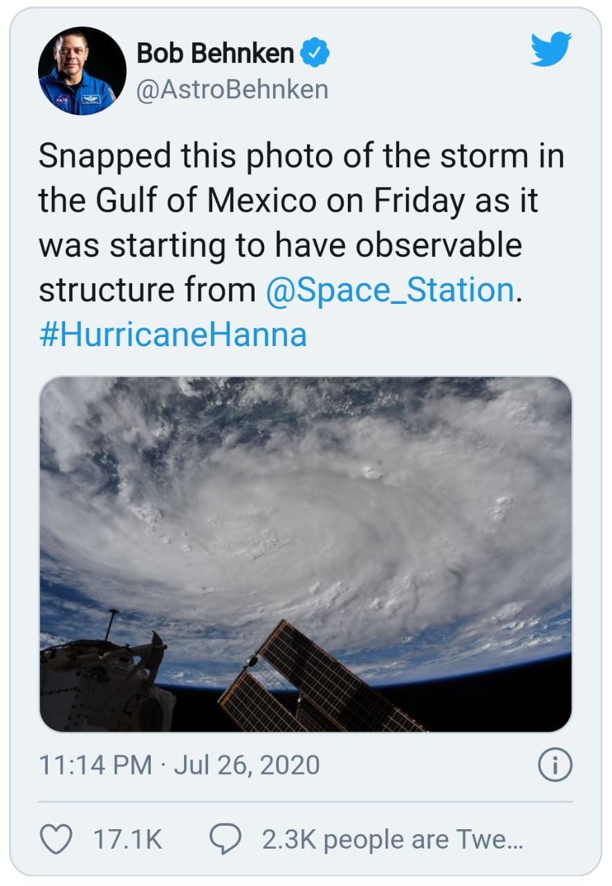 अंतरिक्ष यात्री बॉब बेहेनकेन ने अंतरराष्ट्रीय अंतरिक्ष स्टेशन (आईएसएस) से देखे गए तूफान हना की तस्वीर साझा करने के लिए ट्विटर पर लिया। “उन्होंने शुक्रवार को मैक्सिको की खाड़ी में तूफान की इस तस्वीर को खींचा क्योंकि यह स्पेस स्टेशन से अवलोकन योग्य संरचना शुरू कर रहा था,” उन्होंने ट्वीट किया