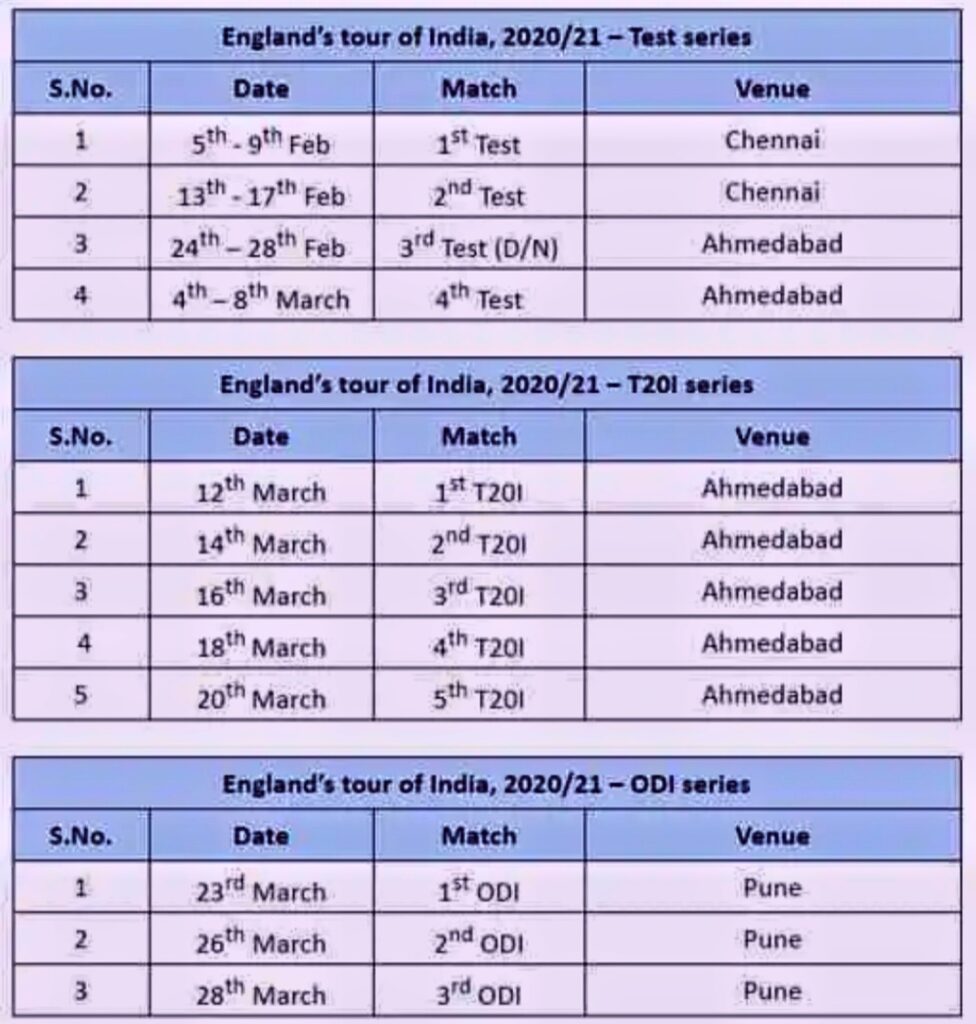 Front News Today: भारतीय क्रिकेट कंट्रोल बोर्ड (BCCI) ने गुरुवार को इंग्लैंड के भारत दौरे के लिए कार्यक्रम की घोषणा की, जो 5 फरवरी, 2021 से चार मैचों की टेस्ट श्रृंखला के साथ शुरू होगा। श्रृंखला का तीसरा मैच डे-नाइट होगा, जो अहमदाबाद में आयोजित किया जाएगा।