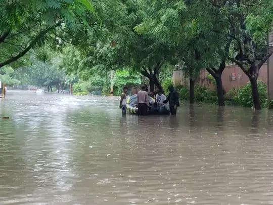 (Front News Today) दिल्ली-एनसीआर में आज सुबह से हुई तेज बारिश के कारण हर तरफ सड़क पर पानी भर गया।