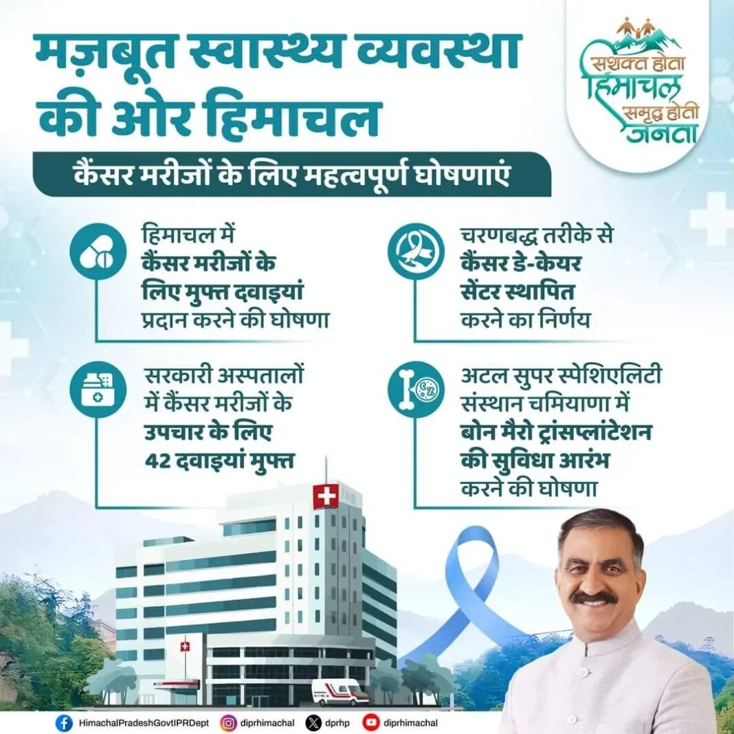 हमारी सरकार ने कैंसर मरीजों के लिए मुफ्त दवाइयां और कैंसर डे-केयर स्थापित करने का निर्णय लिया है।