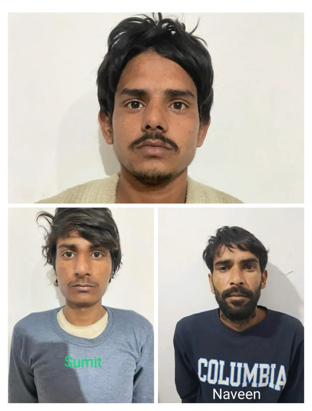 पुलिस प्रवक्ता सूबे सिंह ने बताया कि गिरफ्तार किए गए आरोपियों में नवीन(32), सचिन उर्फ राजा(24) तथा सुमित उर्फ भूत(21) का नाम शामिल है। तीनों आरोपी फरीदाबाद के अनंगपुर गांव के रहने वाले हैं और तीनों आरोपी स्मैक का नशा करते हैं तथा नशे की आपूर्ति के लिए चोरी की वारदातों को अंजाम देते हैं। क्राइम ब्रांच की टीम ने गुप्त सूत्रों की सूचना के आधार पर आरोपी नवीन तथा सचिन को अलग-अलग स्थान से चोरी की मोटरसाइकिल सहित काबू किया था। आरोपी नवीन को थाना सराय तथा आरोपी सचिन को सेक्टर 8 थाने लाकर उनके खिलाफ चोरी का मुकदमा दर्ज करके अदालत में पेश किया गया जहां से उन्हें एक दिन के पुलिस रिमांड पर लेकर मामले में गहनता से पूछताछ की गई जिसमें सामने आया कि आरोपी नवीन ने यह मोटरसाइकिल पलवल से तथा सचिन ने दिल्ली से चोरी की थी। पुलिस पूछताछ में आरोपियों ने अपने साथी सुमित के बारे में पुलिस को सूचना दी। इसके पश्चात पुलिस ने आरोपी सुमित को भी गिरफ्तार कर लिया। पुलिस जांच में सामने आया कि आरोपी बहुत ही शातिर किस्म के चोर हैं जो अपनी अय्याशी के लिए चोरी की वारदातों को अंजाम देते हैं। आरोपी दिन के समय घरों की रेकी करते हैं तथा मौका लगते ही चोरी की वारदात को अंजाम देकर फरार हो जाते हैं। पुलिस जांच में सामने आया कि इनमें मुख्य आरोपी नवीन है जिसके खिलाफ चोरी के 10/11 मुकदमे दर्ज हैं वहीं आरोपी सचिन तथा सुमित के खिलाफ भी 8-10 मुकदमे चोरी के दर्ज हैं। आरोपियों ने सूरजकुंड एरिया में चोरी की 6 तथा एसजीएम नगर तथा कोतवाली एरिया में भी एक-एक वारदात को अंजाम दिया है जिनमें से आरोपियों के कब्जे से 31600 रुपए बरामद किए गए हैं। आरोपी सुमित को सूरजकुंड के एक बेल जंपर के मुकदमे में भी गिरफ्तार किया गया है। पुलिस पूछताछ पूरी होने के पश्चात आरोपियों को अदालत में पेश करके जेल भेज दिया गया है।