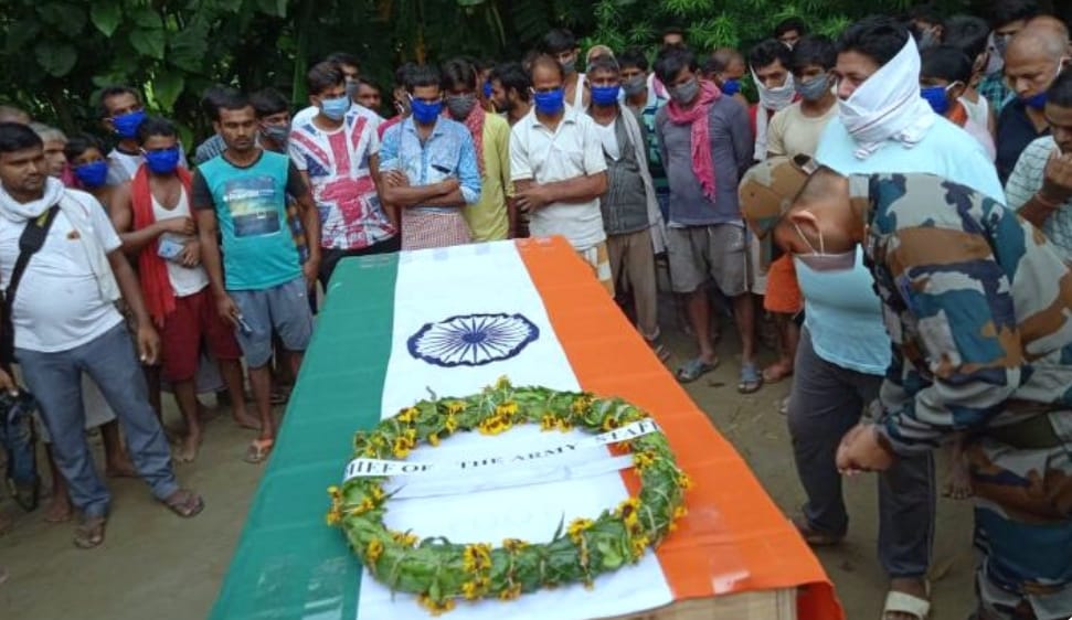 (Front News Today) सीवान के हसनपुरा प्रखंड के महूवल-महाल गांव से लेकर सिसवन घाट तक बुधवार को अलग ही नजारा था. क्या बच्चे, क्या बूढ़े, क्या महिला, क्या पुरुष सभी लोग नम आंखों से हाथो में तिरंगा और जुबा पर वंदे मातरम, भारत माता की जय के नारे के साथ महुवल-महाल के लाल मा भारती के सच्चे सपूत आर्मी के जवान ब्रजेश मिश्र (37) को अंतिम विदाई के लिये कतारबद्ध लगे थे.विदित हो कि एमएच नगर थाना क्षेत्र के महूवल-महाल निवासी आर्मी जवान ब्रजेश मिश्र (37) की जम्मू-कश्मीर में शनिवार 25 जुलाई की संध्या ड्यूटी के दौरान हृदयगति रुकने से मौत हो गई. वे आर्मी के कोर ऑफ ईएमई में नायक पद पर पोस्टेड थे. बुधवार अहले सुबह जम्मू से उनके रेजिमेंट के जेसीओ तथा जवानों के साथ उनका शव महूवल-महाल गांव पहुचा. जवान के शव के गांव पहुचने की खबर सुन पूरे नगर क्षेत्र के लोग उनके अंतिम दर्शन को उमड़ पड़े.