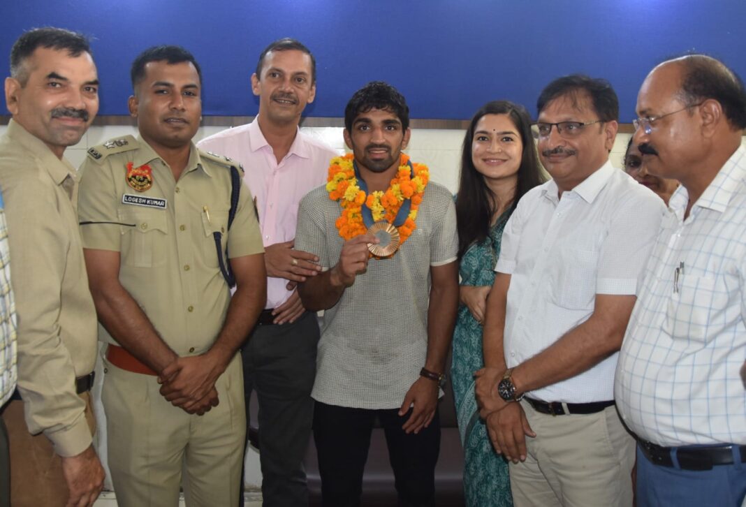 ओलंपिक पदक विजेता अमन सहरावत का स्वागत करते हुए जिला उपायुक्त कैप्टन शक्ति सिंह।