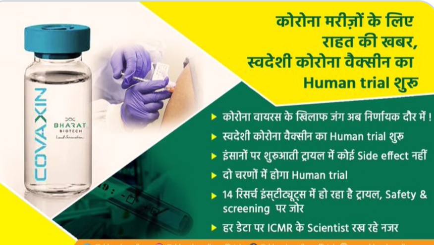 भारत में कोरोना वैक्सीन ट्रायल को मिल रही कामयाबी का जिक्र खुद स्वास्थ्य मंत्री हर्षवर्धन ने किया है. डॉक्टर हर्षवर्धन ने ट्वीट करके कहा, ‘ स्वदेशी कोरोना वैक्सीन का ह्यूमन ट्रायल शुरू! कोविद 19 के खिलाफ जंग अब निर्णायक दौर में है. पिछले कई महीनों से कोरोना वैक्सीन के विकास के लिए जारी प्रयास के सकारात्मक संकेत मिलने लगे हैं. हम जल्द ही इस महामारी पर पूरी तरह जीत प्राप्त कर लेंगे.